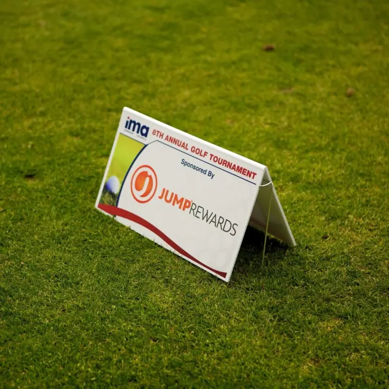 Our most popular golf sponsor signs for tournaments. Stand out recognition at each tee box, H-stakes or wires included, and multiple sizes for any sponsor or tournament.